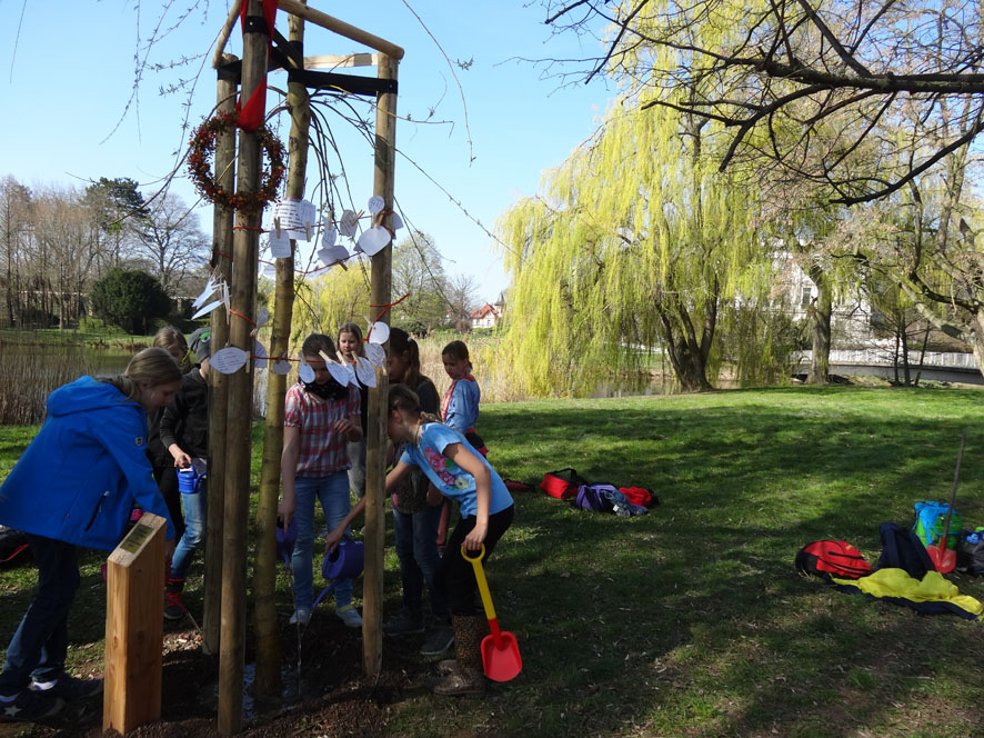 Die Grundschüler der Klasse 4b aus Leipzig-Connewitz beschäftigten sich mit Landschaftsarchitektur in ihrer unmittelbaren Umgebung: dem Agra-Park in Leipzig. Ehemals privat etablierte sich das Gelände seit 1950 durch verschiedene Garten- und Landwirtschaftsausstellungen zu einem der beliebtesten Naherholungsgebiete im Leipziger Süden. Nach einer intensiven Erkundung des Parks und seiner Struktur, der einzelnen Teile, Bauwerke und Wegenetze konnten die Schüler in Kooperation mit dem Kinder-Umwelt-Bus die natürlichen Lebensräume im Park erforschen. Mit ihrer Collage holte sich die Klasse außerdem einen Sonderpreis beim Fotowettbewerb »Mein Agrapark« und pflanzte als Belohnung einen neuen Baum im Park.