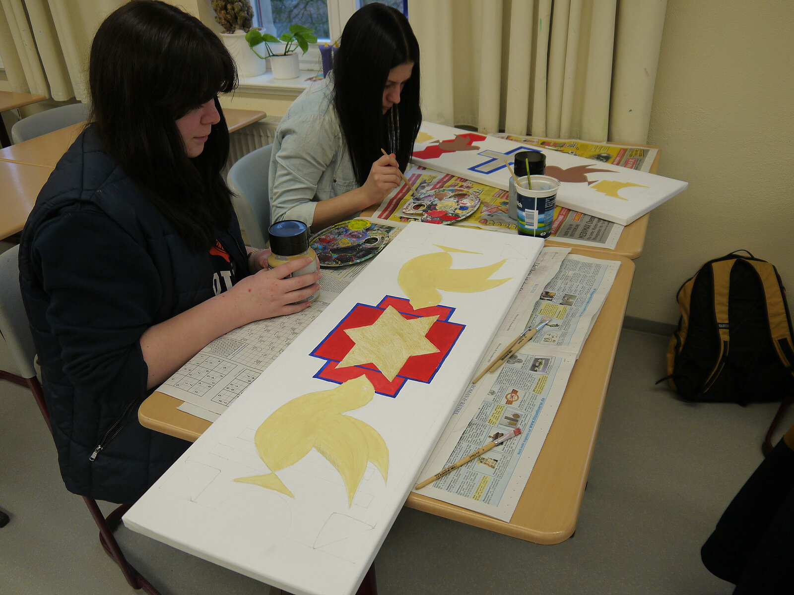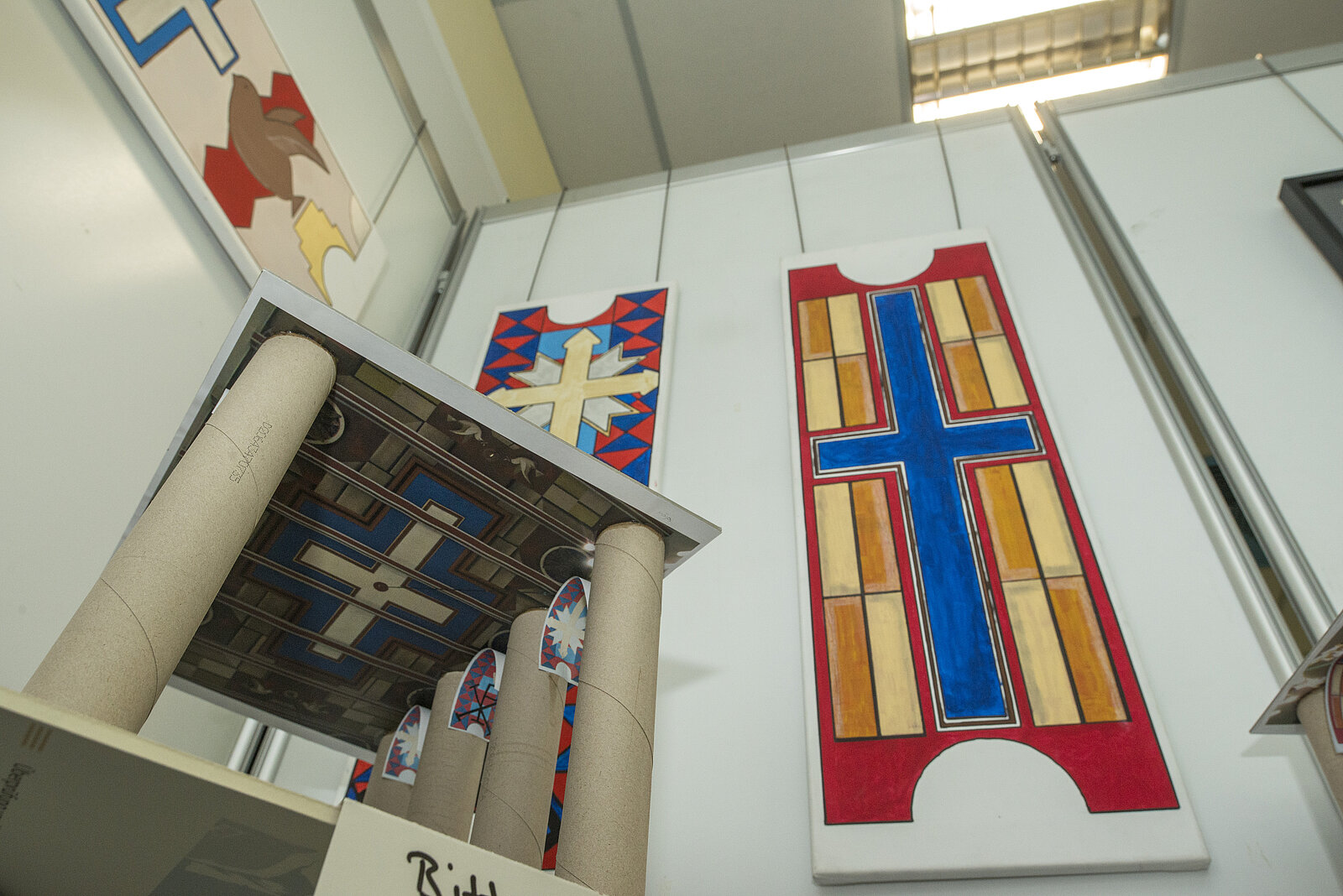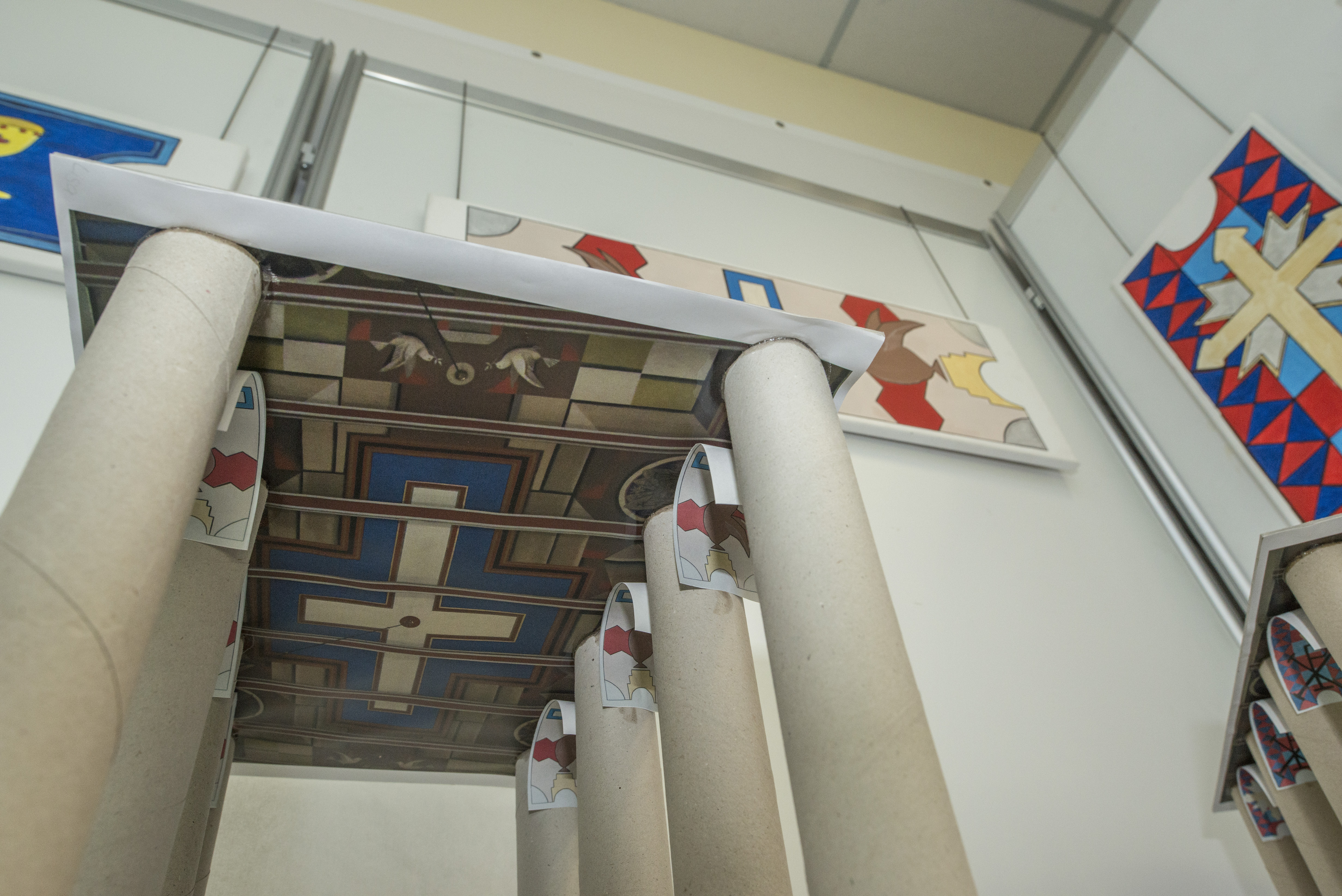In der Seminarschule Auerbach setzten sich die Oberschüler des Vertiefungskurses Kunst mit der Lutherkirche in Ellefeld auseinander. In dem beeindruckenden Bau aus den 1920er Jahren dominiert eine expressionistisch ausgemalte Decke den Innenraum. Die früher farbig gestalteten Gewölbebögen sind heute schlicht weiß. Aufgabe der Schüler war es, unterschiedliche Raumwirkungen durch Veränderungen des Kircheninneren zu untersuchen. Neben der neuen Gestaltung der Gewölbebögen, die im Modell neben der Decke installiert werden konnten, wurden auch die tragenden Stützen des Raums neu interpretiert und im Foto in den Innenraum montiert.