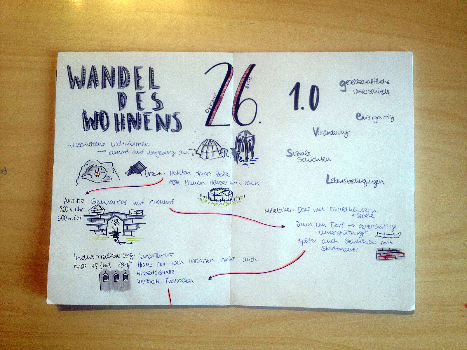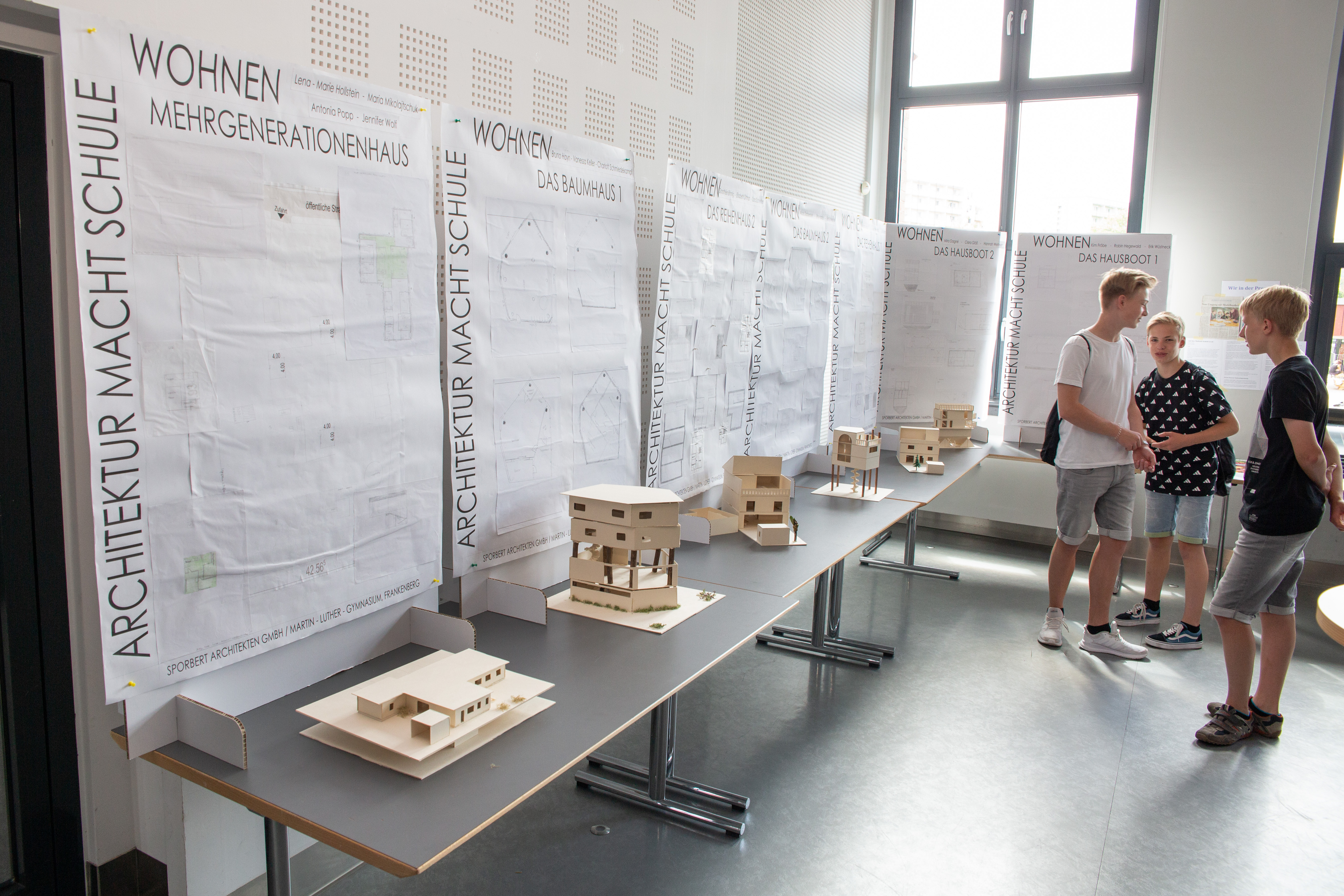 Die Schülerinnen und Schüler des Martin-Luther-Gymnasiums Frankenberg beschäftigten sich zum Projektbeginn von „Architektur macht Schule“ mit dem Berufsbild des Architekten und besuchten u.a. das sie betreuende Architekturbüro von Olaf Sporbert. Schon da wurden künstlerische Tagebücher begonnen, um alle wichtigen Informationen, Eindrücke und Ideen festhalten zu können. Das von ihnen dann bearbeitete Thema war dem Wohnen in Vergangenheit und Gegenwart gewidmet, was mit beruflichen und gesellschaftlichen Lebensräumen in Verbindung steht. Nach einer intensiven analytischen Auseinandersetzung mit dem Wandel des Wohnens wurden aus der gesamten Projektgruppe sieben Kleinere gebildet, um neue Wohnkonzepte für ein Hausboot, Baumhaus, Mehrgenerationenhaus oder Reihenhaus zu entwickeln. Die Architekten hatten hierfür Raumprogramme vorgegeben, was die Schüler natürlich vor besondere Herausforderungen stellte: das nur 10 auf 5 Meter messende Hausboot sollte alle notwendigen Wohnfunktionen beherbergen und natürlich nicht umkippen; das Baumhaus war mit einer unregelmäßigen Grundform zwischen 6 Bäume zu konzipieren und, wie die Jugendlichen bald herausstellten, nur mit einer Wendeltreppe erschließbar; das Mehrgenerationenhaus war gleichermaßen für Singles, Familien und Senioren zu konzipieren, sollte Gemeinschaftsorte wie Rückzugsräume für alle beherbergen und für das Reihenhaus waren die Grundmaße vorgegeben. Die Schülerinnen und Schüler erstellten eigene, den Bedürfnissen ihrer Generation entsprechende Wohnkonzepte, zeichneten Grundrisse und bauten akribisch Modelle.