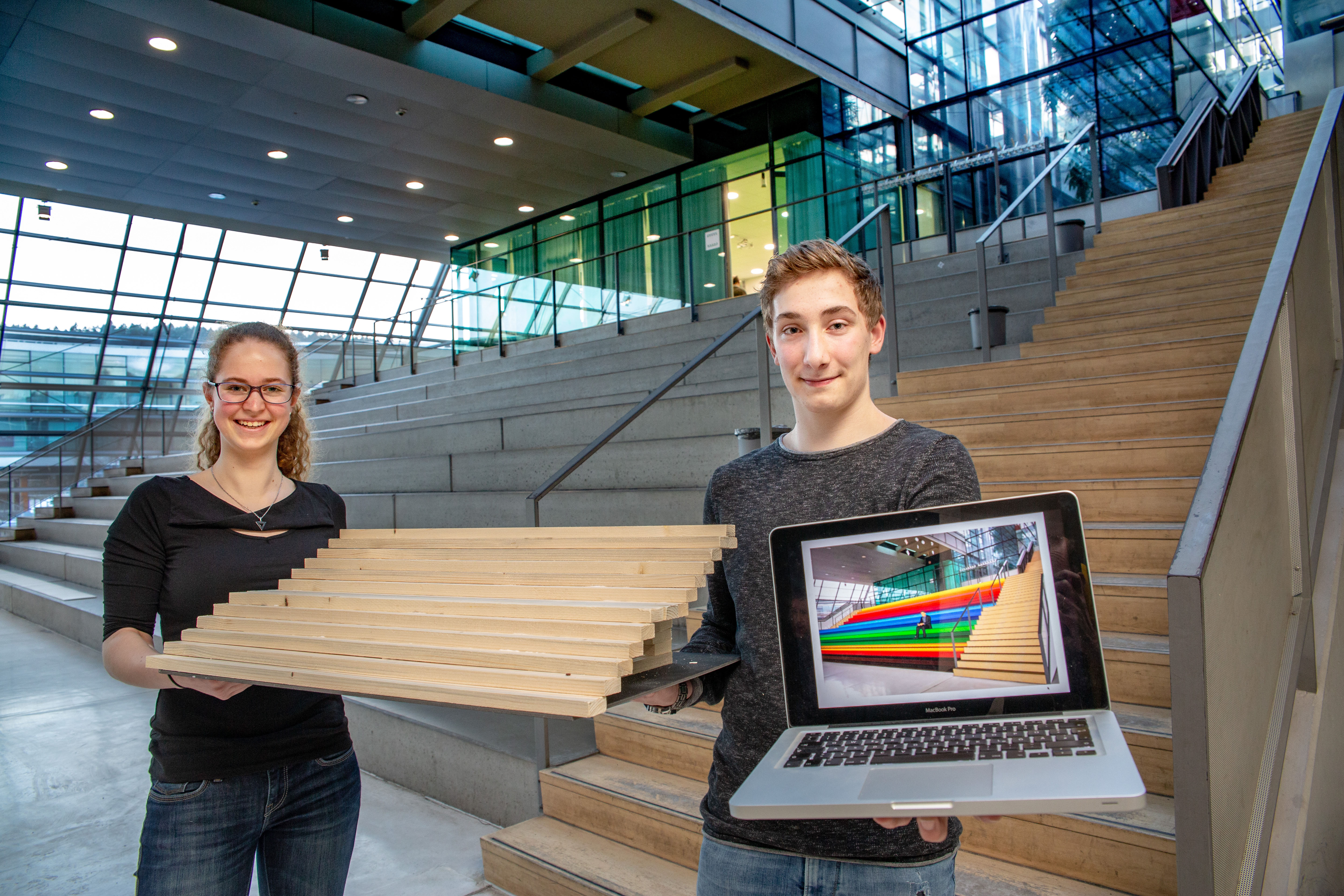 Die klassenübergreifende Projektgruppe aus Flöha startete in das Projekt „Architektur macht Schule“ mit dem Wunsch, gestalterische Defizite an ihrer eigenen Schule nicht nur aufzuzeigen, sondern ihnen auch gleich künstlerisch entgegenzuwirken. Bei der Spurensuche vor Ort waren schnell der Eingangsbereich des Gymnasiums, die große Treppe im Foyer und die beschädigte Bauhaltestelle an der Schule ausfindig gemacht, die aufgewertet werden sollen. Der Ideenfindung gingen theoretische Betrachtungen zu Architektur und Stadt voraus, wobei sie sich auch der Problematik der richtigen Größenverhältnisse annahmen. Um angemessene Maßstäblichkeit besser verstehen zu können, wurde kurzerhand die eigene Lehrerin vermessen und in den richtigen Maßstab geschrumpft. Anschließend folgte der kreative Teil des Projektes: anstelle der vergilbten, beschädigten und verwitterten Plastikwand am Eingang entwickelten die Schülerinnen und Schüler eine farbig akzentuierte, holzvertäfelte Wandscheibe mit deutlich sichtbarem Namenszug und Schuluhr. Die große, als grau, trist und zudem beim Sitzen als unbequem empfundene Eingangstreppe wurde visualisiert, im Modell gebaut und letztlich schon einmal auf diese Weise mit farbigen Sitzauflagen versehen. Beide Vorschläge dienen nun als Ideenvorschlag für künftige Umgestaltungen. Realisiert werden konnte die Gestaltung des Buswartehäuschen vor der Schule. Die kaputten Scheiben wurden durch (von der Stadt Flöha gesponserte) Seitenwände ersetzt, für die zunächst künstlerische Entwurfsvorlagen erarbeitet wurden und dann gemeinsam mit dem Künstler Jens Ossada als Graffiti auf die Tafel aufgebracht wurden.