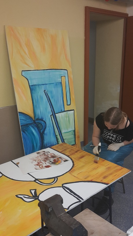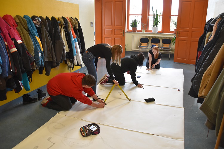 Den Schülerinnen und Schülern der Oberschule Olbernhau war schnell klar, was sie gern in ihrem eigenen Schulgebäude verändern möchten. Die Umgestaltung des tristen und mangelhaft beleuchteten Schulflurs war für die Teilnehmenden ein großer Wunsch. Beflügelt von neuen Eindrücken des SMAC, dem Gunzenhauser-Museum Chemnitz und dem Bauhaus-Museum Weimar gestalteten die Schülerinnen und Schüler Modelle für die mögliche Wandgestaltung. Die Schülerinnen und Schüler fertigten Wandmalereien an, die die Fachräume des Flures repräsentieren. Mit den 1 x 2 Meter großen Gipskartontafeln mit Sport-, Küchen- und Musikmotivik konnten die Schülerinnen und Schüler ihrer Schule eine individuelle Note verleihen.
